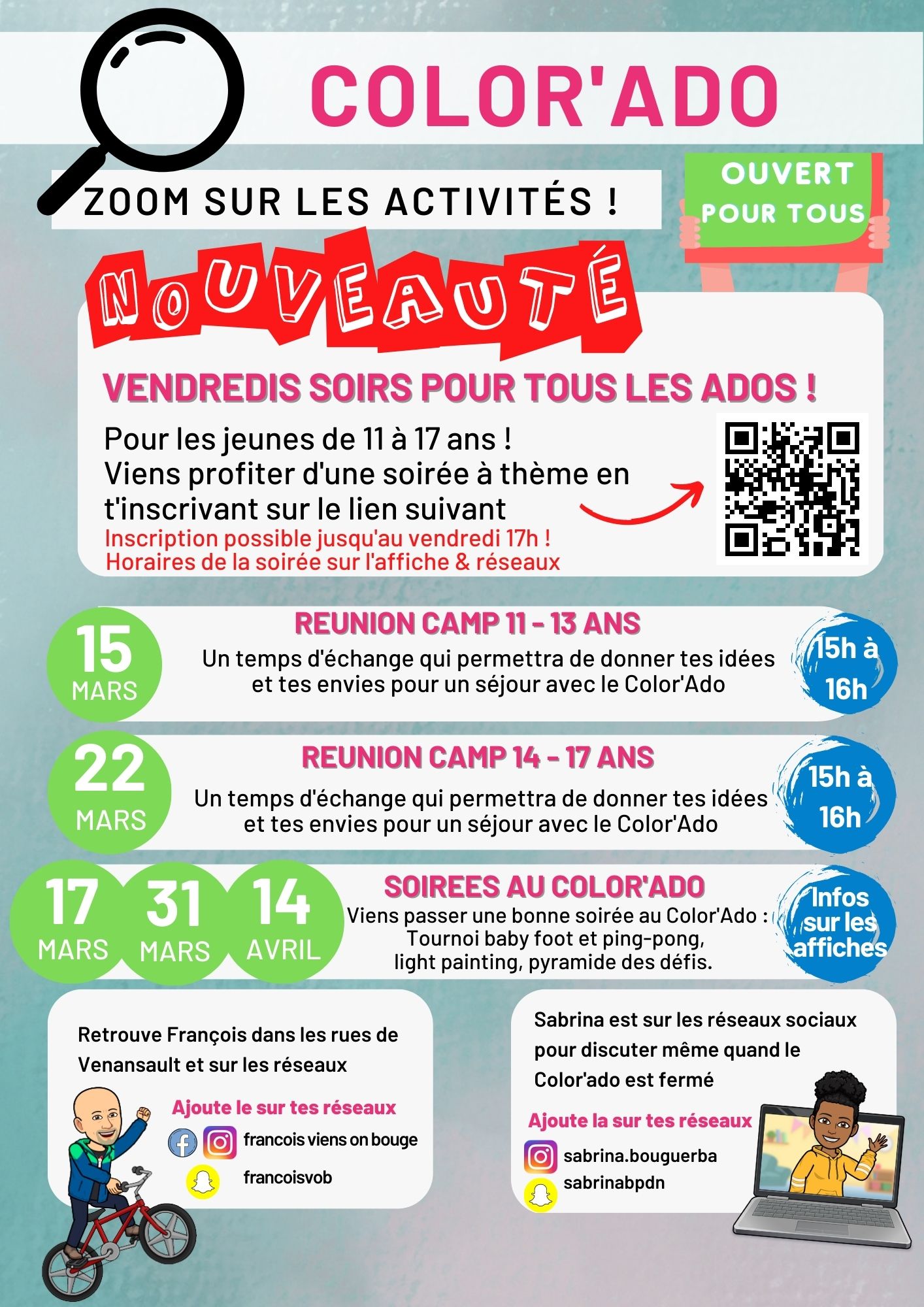 Pour participer aux activités du Color’Ado, il faut s’inscrire et remplir un dossier ou le modifier si c'est un renouvellement. Vous pouvez cliquez sur les liens ci-dessous pour télécharger les documents :