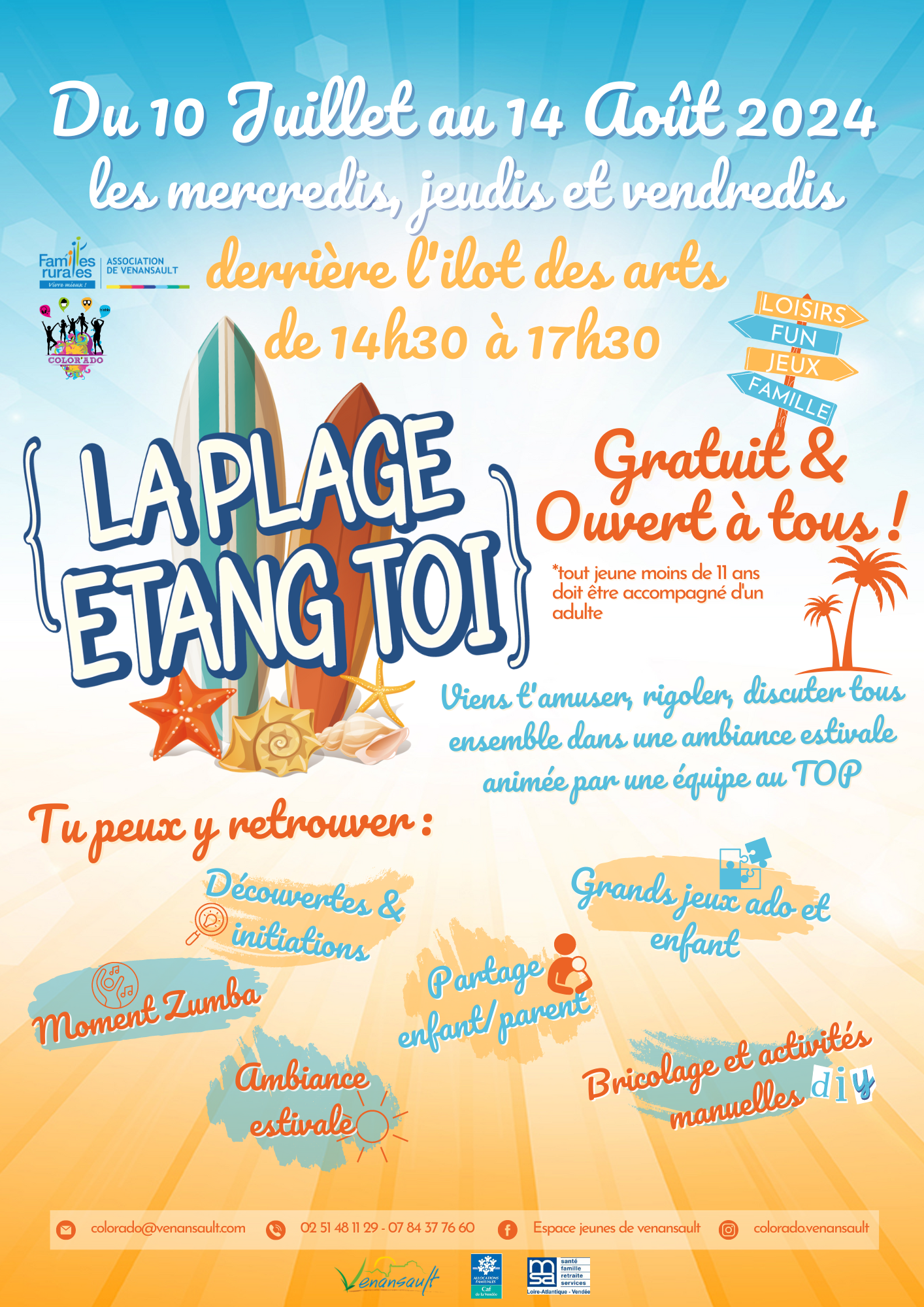 « La Plage Etang-Toi » est un espace de détente et de loisirs adapté aux jeunes et aux familles qui peuvent y participer gratuitement et librement. Il y a des animations autour du jeu, du sport ou de la découverte adaptées aux différents publics. Chaque jour un prestataire différent vient pour proposer encore plus d’activités. Entre 5 et 6 animateurs sont présents sur cet espace pour accueillir les jeunes, les familles et dynamiser l’espace.