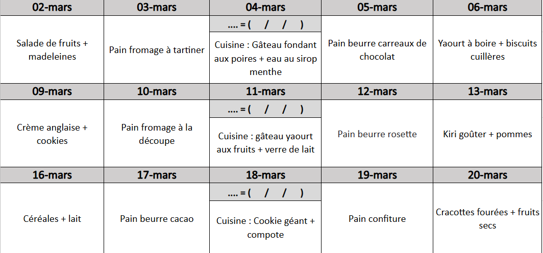 Le planning des goûters est élaboré afin de respecter au maximum l’équilibre alimentaire des enfants en fonction des repas prévus au restaurant scolaire le midi. Afin de proposer un goûter adapté aux besoins de l'enfant, nous nous appuyons sur les recommandations d'une diététicienne.