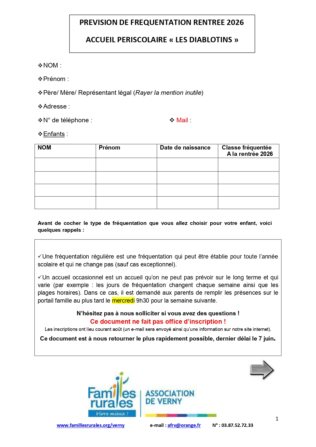 Voici le document à remplir pour une demande de nouvelle inscription pour la rentrée de septembre 2026 et à nous retourner.