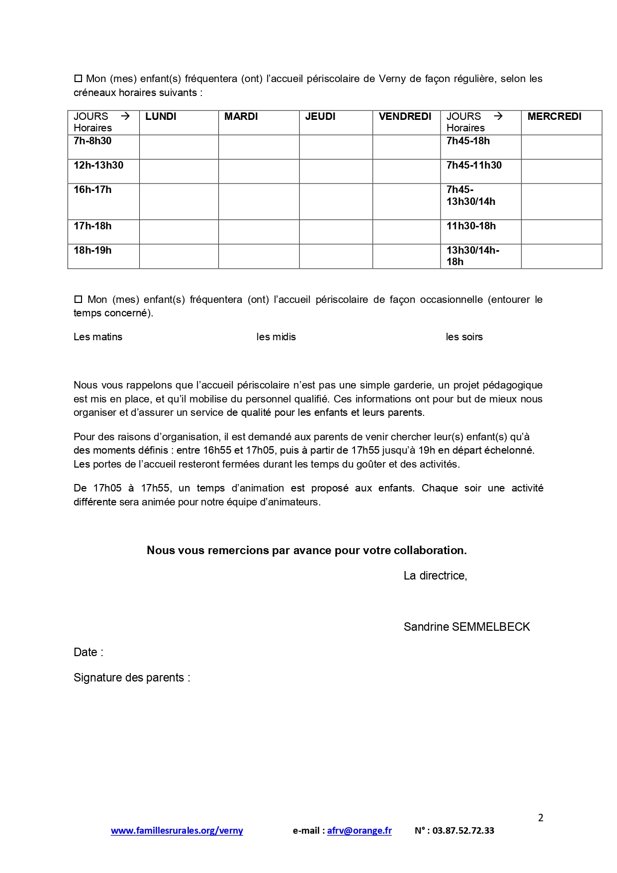 Pour tous renseignements merci de nous joindre ou de passer à l'accueil pendant les tranches horaires ci-dessus.