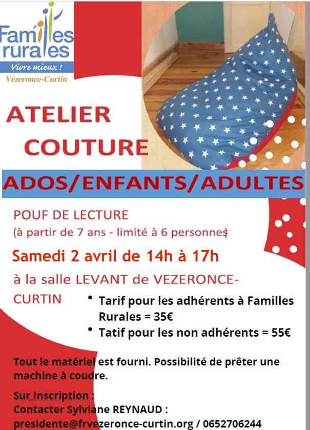 Vous voulez vous faire un pouf de lecture ? Eh bien, c'est possible en vous inscrivant à l'atelier de couture de Familles Rurales prévu le Samedi 2 avril 2022.