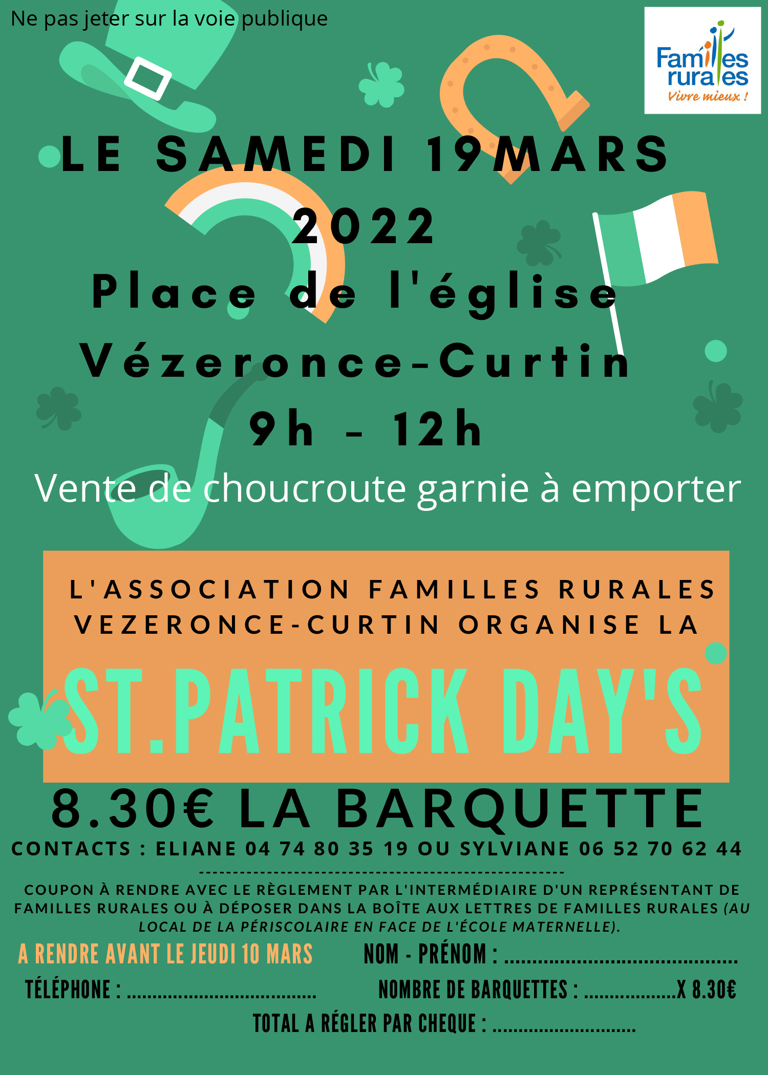 Le Samedi 19 mars 2022, Familles Rurales Vézeronce-Curtin réédite pour le Saint-Patrick Day's la vente de choucroute garnie, en barquette individuelle.