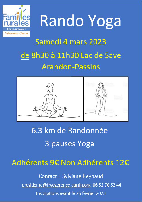 Venez participer à la sortie Rando Yoga le Samedi 4 mars 2023 avec Familles Rurales Vézeronce-Curtin, ouverte à tous, adhérents ou non adhérents :