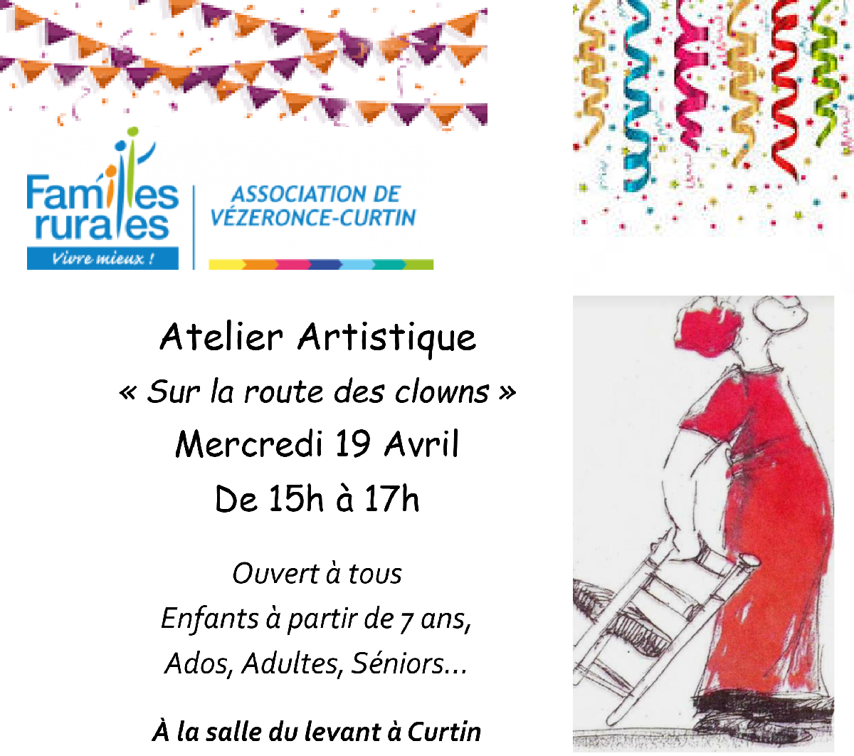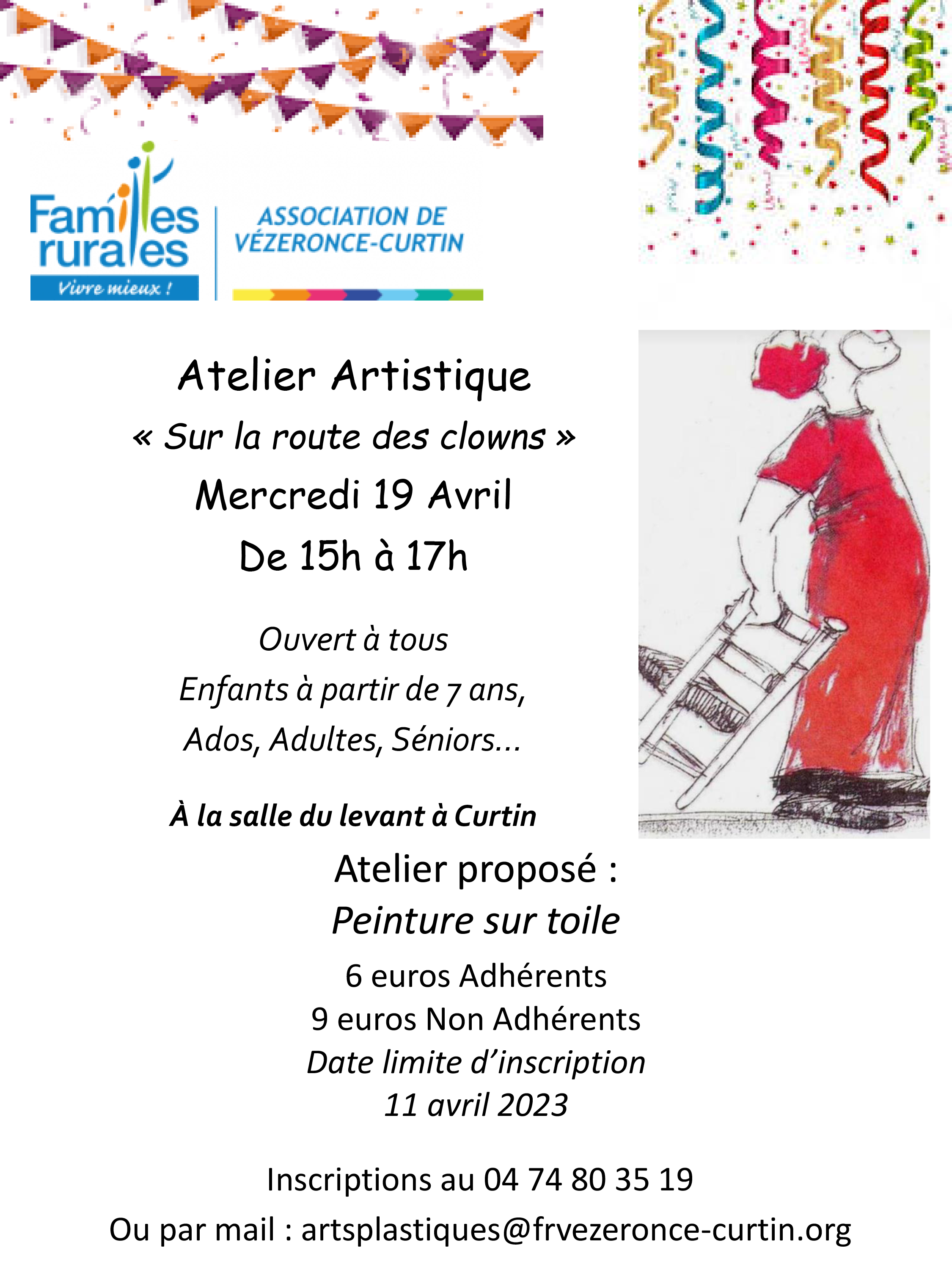 Venez participer à l'Atelier artistique "Sur la route des clowns" - le mercredi 19 avril 2023 de 15h00 à 17h00 à la salle du Levant à Curtin. Atelier Peinture sur toile ouvert aux enfants à partir de 7 ans, aux ados, aux adultes et aux séniors.