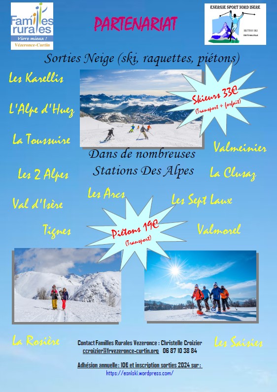 Notre association sera donc relais d'information. Christelle Croizier adhérente à Familles Rurales et adhérente à l'ESNI SKI sera chargée d'annoncer en fin de mois les 3 ou 4 sorties du mois suivant avec le lien pour l'inscription.