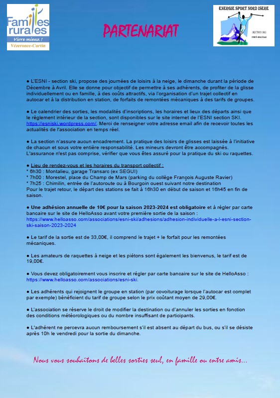 Suite à une rencontre entre nos 2 associations, ESNI SKI et Familles Rurales, nous avons décidé d'établir un partenariat.