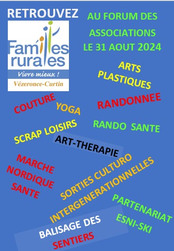 Familles Rurales Vézeronce-Curtin sera présente au forum des associations de Vézeronce-Curtin le samedi 31 août 2024 de 9h00 à 12h00 - Salle du relais 171