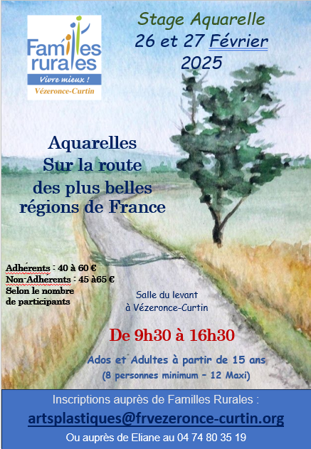 Familles Rurales Vézeronce-Curtin vous propose un stage Aquarelle ayant pour thème "sur la route des plus belles régions de France.