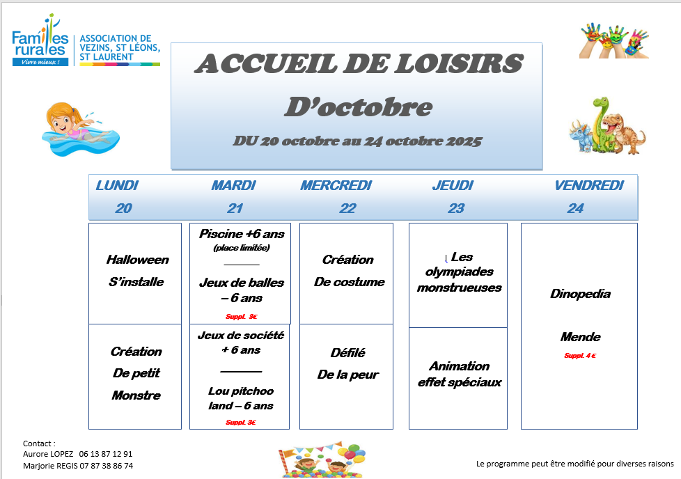 Cette année l'accueil de loisirs de Vezins, St Léons et St Laurent ouvrira du lundi 20 octobre au vendredi 24 octobre, soit 1 semaine.