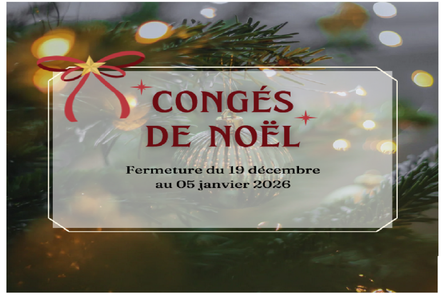 Notre bureau sera fermé pour les vacances de Noël du vendredi 19 décembre au lundi 05 janvier 2026 Nous vous souhaitons de joyeuses fêtes !